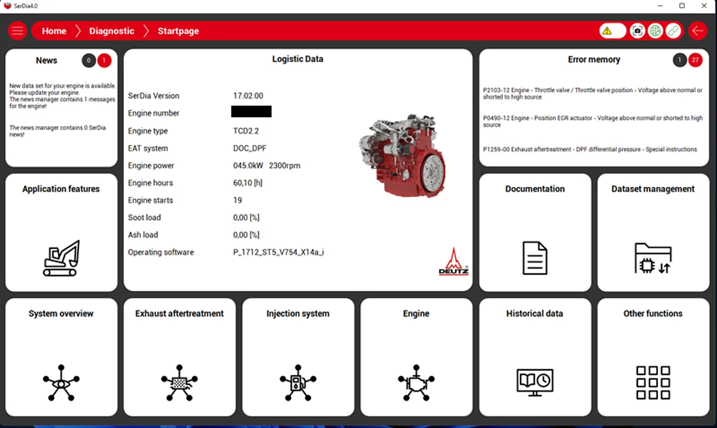 SerDia is the DEUTZ AG diagnostic tool used by service technicians worldwide, enabling professional commissioning, diagnosis and maintenance of all DEUTZ engine series. In addition, various online services are integrated to keep the engine control unit software up to date. This allows you to benefit continuously from further developments. Using the historical data, you can run analyses of the various systems.